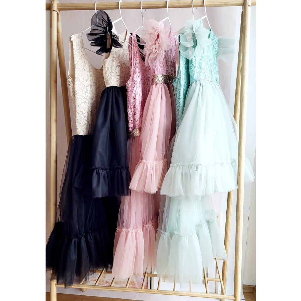 - Dizajn: Bez rukávov, čipkovaný top, vrstvená tylová sukňa s volánom