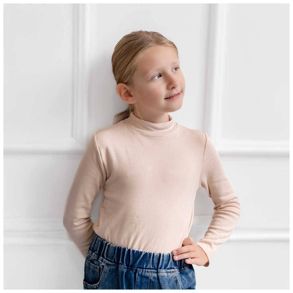 Rolák Kira pre dievčatá je navrhnutý s dôrazom na pohodlie, jednoduchosť a štýl. Jemná telová farba je ľahko kombinovateľná, hodí sa k sukniam, nohaviciam aj šatám. Vrúbkovaný elastický materiál sa krásne prispôsobí detskému telu bez toho, aby obmedzoval pohyb – ideálny na dni plné hier, učenia aj objavovania.