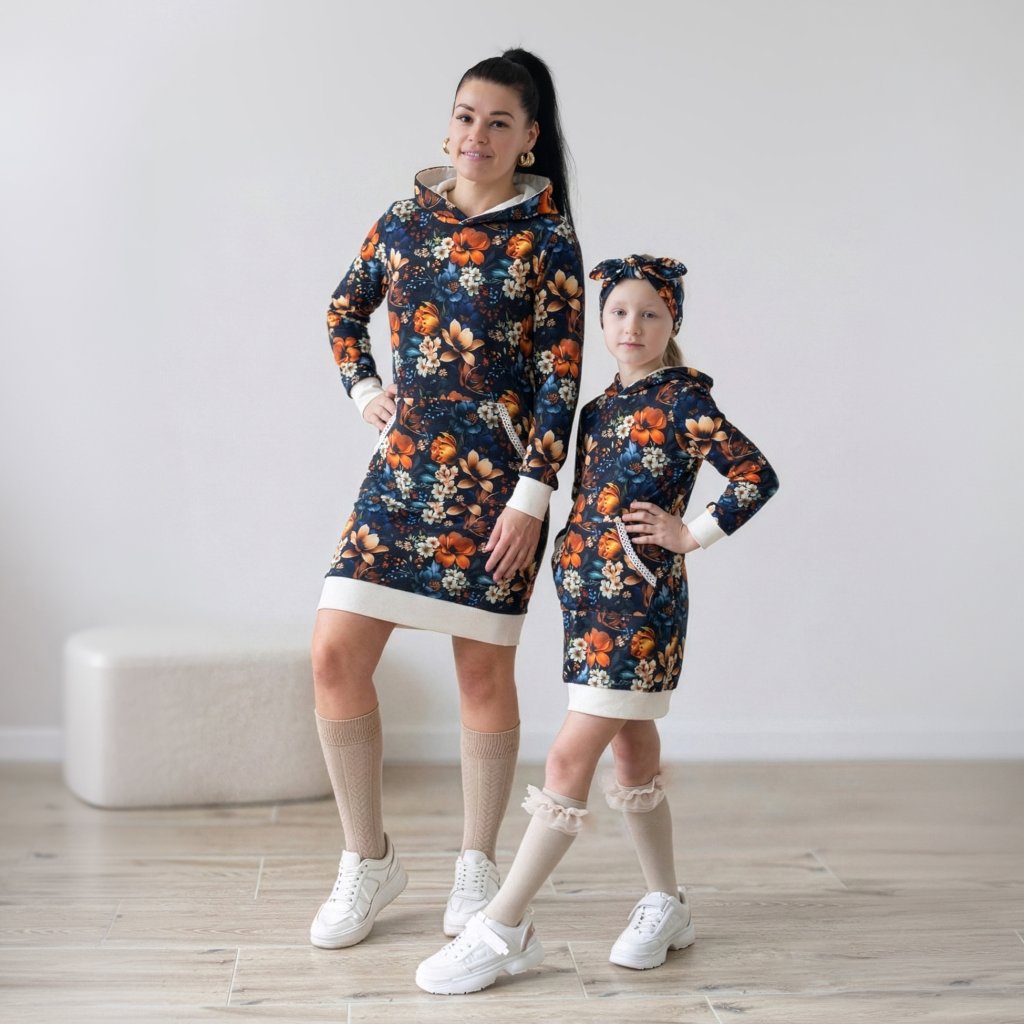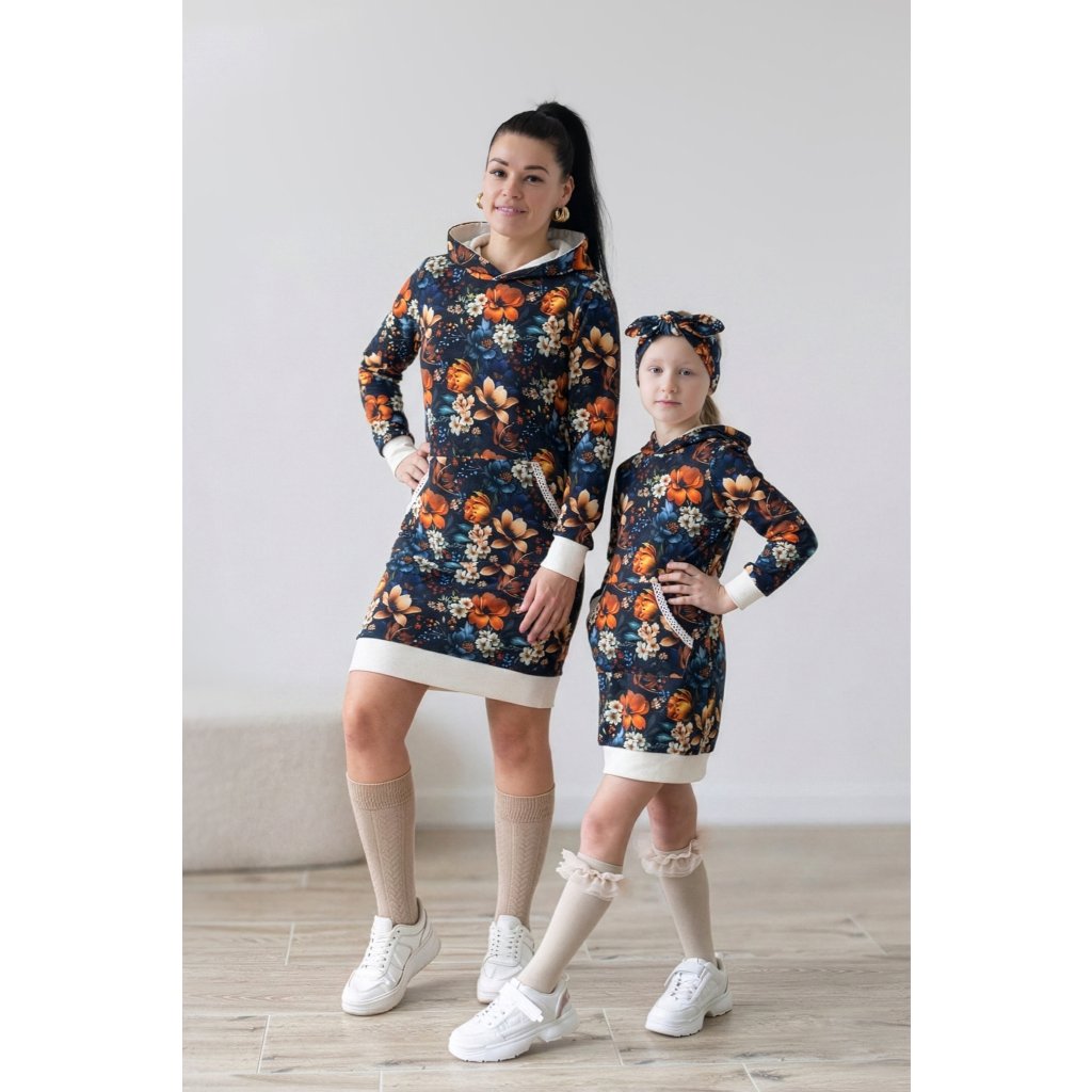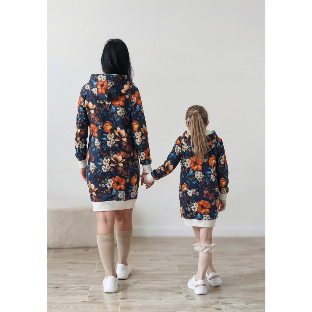 Hľadáte spojenie nežnej romantiky a absolútneho pohodlia? Set mama a dcéra Rosalie je ideálnou kombináciou pre mamičky a ich malé princezné, ktoré milujú pohyb, ale chcú vyzerať elegantne. Jemný vzor ruží na hlbokom nočnom modrom podklade dodáva šatám luxusný nádych, zatiaľ čo obľúbený športový strih s kapucňou a praktickým vreckom zaručí, že sa v nich budete cítiť skvele počas celého dňa. 👩👧💙