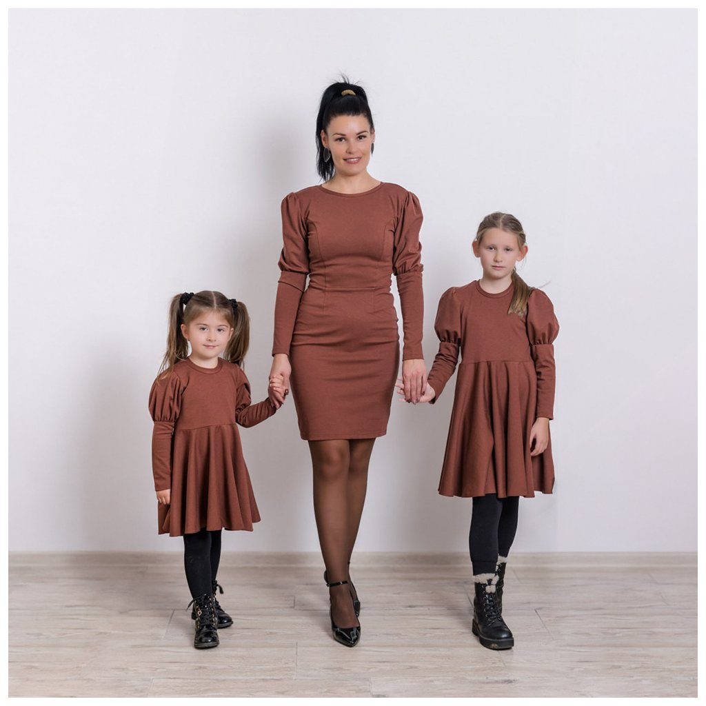 Predstavujeme Ti trojset Anita – zladené šaty pre mamu a dve dcérky v hrejivom odtieni hnedo-karamelovej. Tento model kombinuje jednoduchú eleganciu so zmyslom pre detail, vďaka čomu sa stáva ideálnou voľbou na sviatočné príležitosti, rodinné stretnutia aj každodenné nosenie.