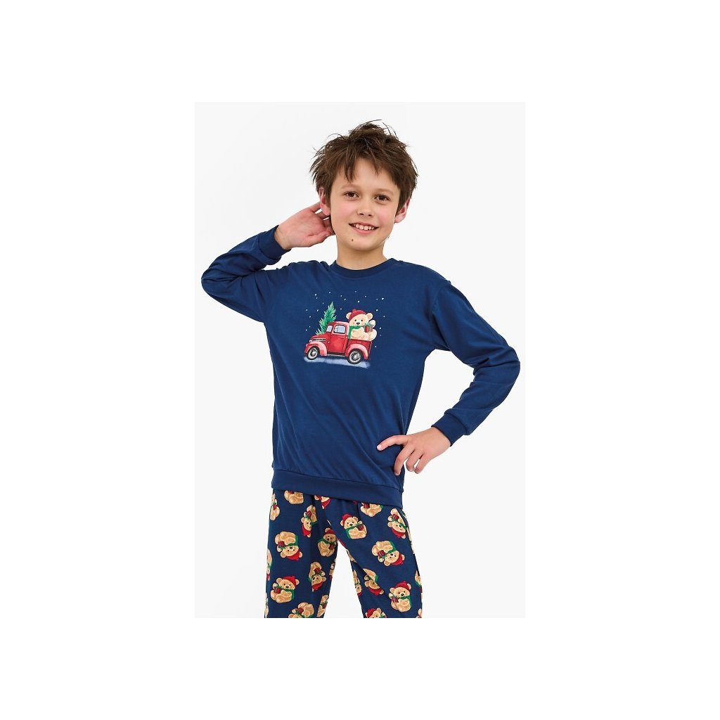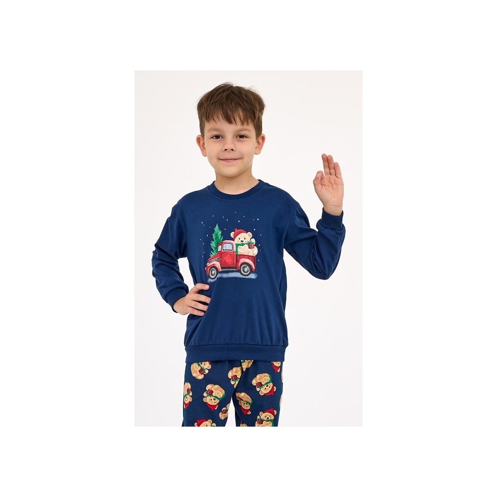 👕 Tričko s dlhým rukávom z jemnej a priedušnej 100 % bavlny je príjemné na dotyk a ideálne aj pre citlivú pokožku. Zdobí ho hravý vianočný motív s autíčkom 🚗 a stromčekom , ktorý okamžite navodí sviatočnú náladu. Dlhé nohavice s veselou potlačou majú pohodlný elastický pás, ktorý sa prispôsobí postave, a vďaka manžetám na rukávoch aj nohaviciach pyžamo perfektne sedí počas celej noci.