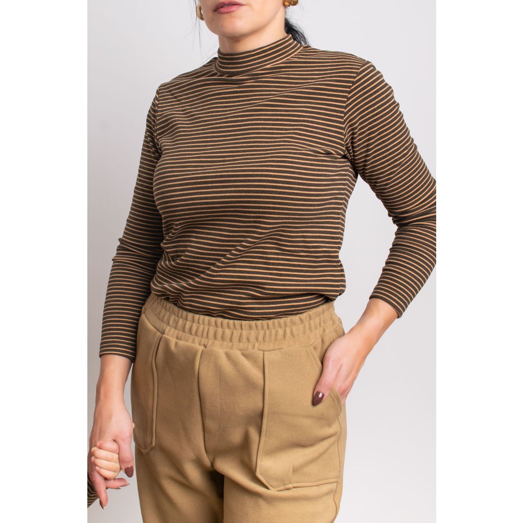 Polorolák má jemne stojačikový golier, ktorý ochráni krk v chladnejšom počasí, ale nepôsobí stiesnene. Pruhovaný dizajn dodáva nadčasový vzhľad a ľahko sa kombinuje – s džínsami, teplákmi aj sukňou.